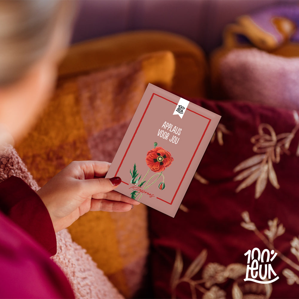 Klaproos zaadjes ‘Applaus voor jou’. Circa 1800 zaden. Geef iemand een welverdiend compliment met dit zakje klaproos zaadjes, want "applaus voor jou" is wat ze verdienen! Of het nu gaat om het bedanken van iemand voor zijn of haar hulp, het vieren van een prestatie of gewoon het laten weten dat je iemand waardeert, deze mooie zaadjes zijn een perfect gebaar. De klaproos, met zijn opvallende bloemen, staat symbool voor kracht en schoonheid – net als de persoon die je wilt complimenteren.