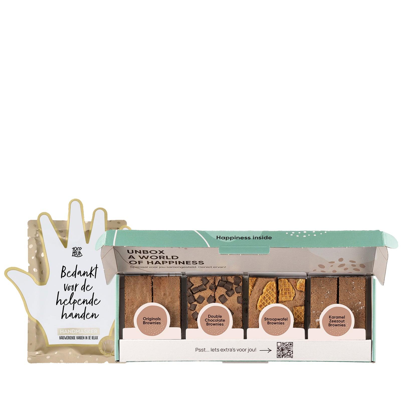 Bedankt voor jouw hulp! Een leuk cadeau als bedankje voor de helpende handen. Laat de hardwerkende handen ontspannen. De verzorgende en hydraterende gel in het handmasker geeft je zijdezachte handen terug. Samen met een box vol verse handgemaakte brownies is dit hét ultieme cadeau!