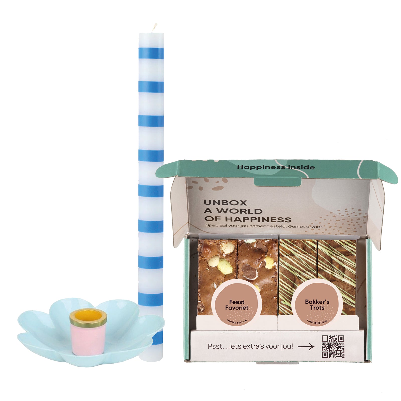 Op zoek naar een showstopper voor op de Paastafel? Kies dan voor dit leuke paascadeau met heerlijke Paasbrownies, prachtige blauwe bloem kaarshouder en blauw met wit gestreepte kaars. Zo is jouw paastafel in één keer super vrolijk!