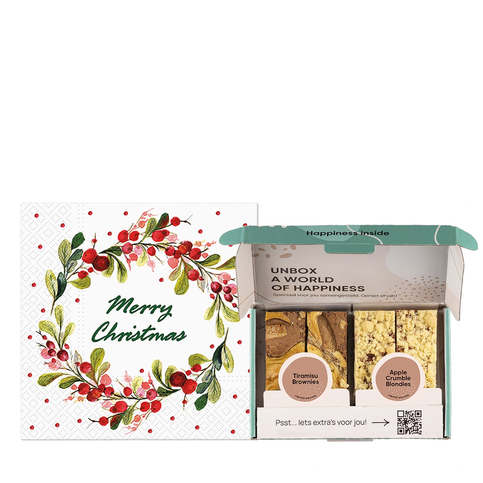 Op zoek naar het leuk Kerstcadeau? Zoek niet verder, want dit brievenbuscadeau gevuld met Kerstbrownies en Merry Christmas servetten is perfect. Het Kerstcadeau past door de brievenbus, zo hoeft de ontvanger niet thuis te zijn! Bestel nu snel, voor 16:00 besteld is dezelfde dag verzonden.