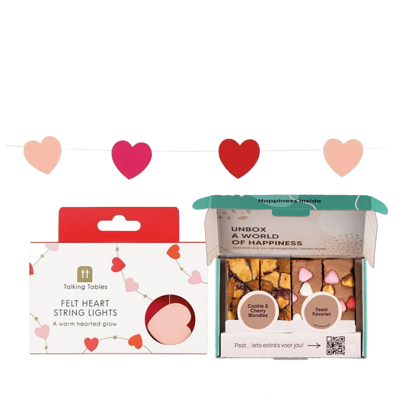 Op zoek naar het perfecte Valentijnscadeau voor hem of haar? Zoek niet verder en ga voor deze cadeaubox gevuld met hartjes lampjes slinger en heerlijke brownies. Gegarandeerd een succes