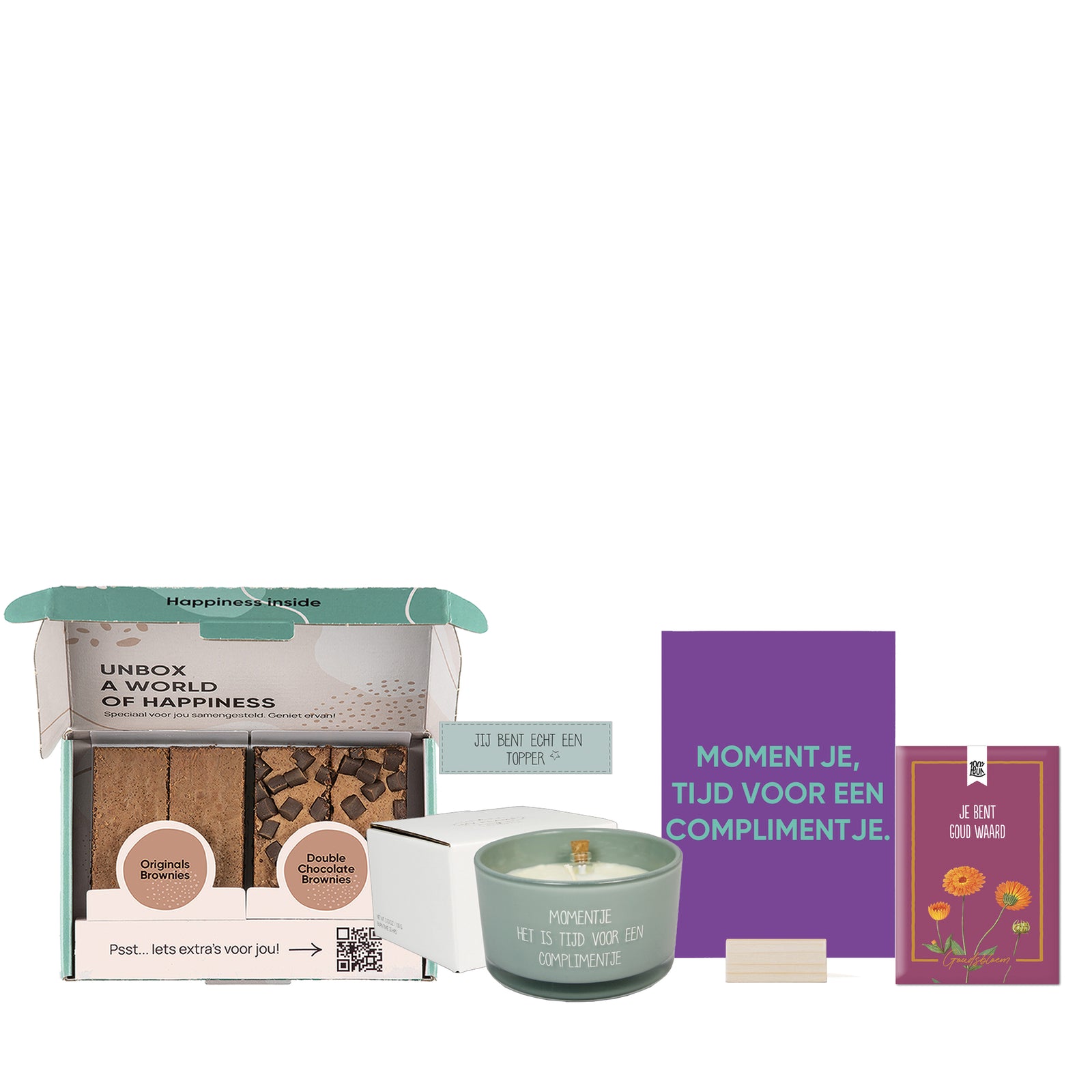 Soms moet je iemand gewoon even overladen met lieve woorden én brownies (want zeg nou zelf, daar word je pas echt blij van). In deze luxe giftbox zitten 2 Double Chocolates en 2 Originals brownies, bloemzaadjes met de tekst ‘Jij bent goud waard!’ en een kaart met kaarthouder: “Momentje, het is tijd voor een complimentje.” Het ideale compliment in cadeauvorm – met een vleugje zoetigheid.