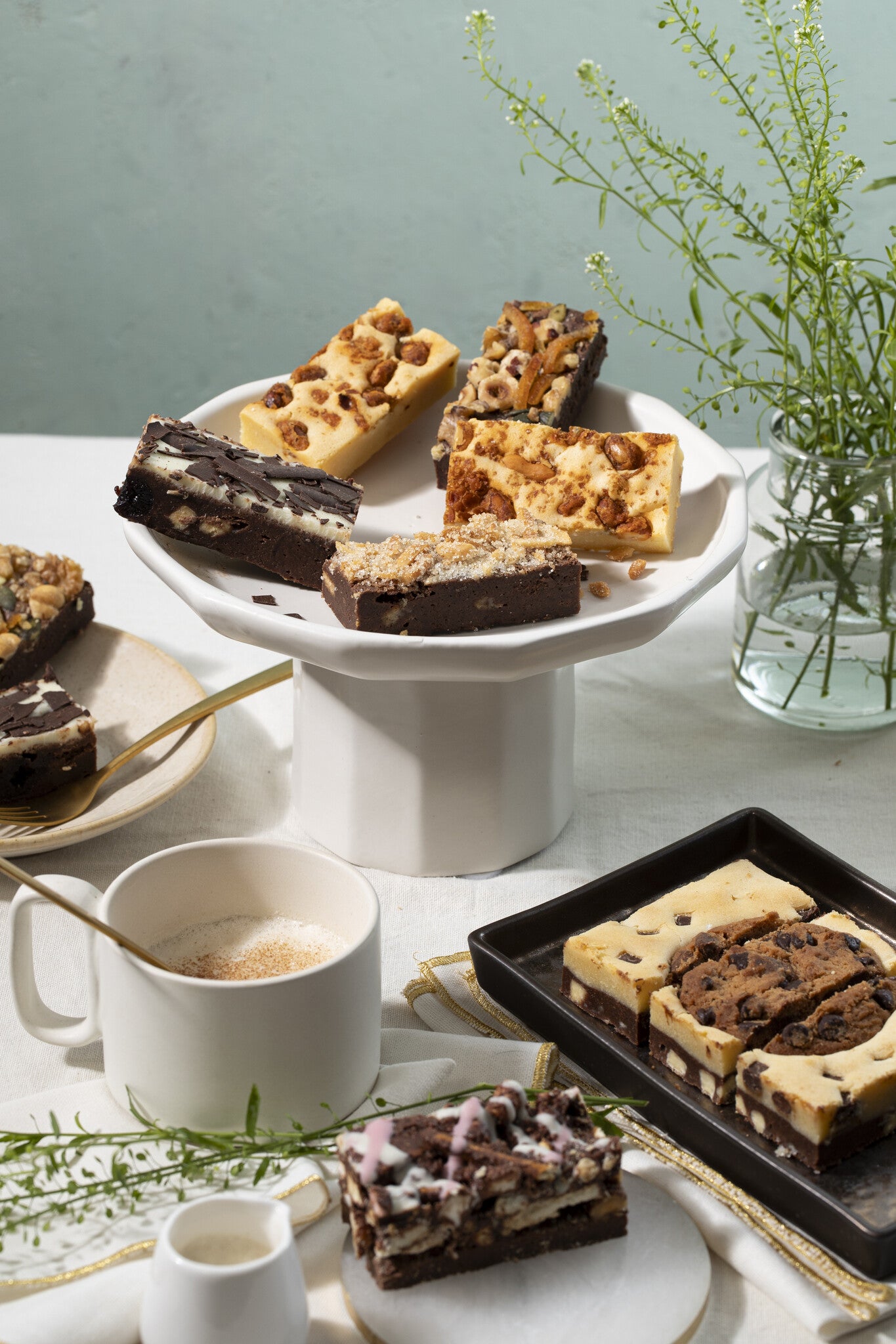 Aan de basis wacht een heerlijke laag brownie, bezaaid met royale stukjes chocolate chip cookies, die een verrukkelijke crunch bieden bij elke hap. Bovenop prijkt onze kenmerkende blondielaag, perfect passend bij de intense chocolade eronder. Dit vormt een heerlijk contrast, waardoor je ervaring wordt verheven naar nieuwe hoogten van verwennerij.