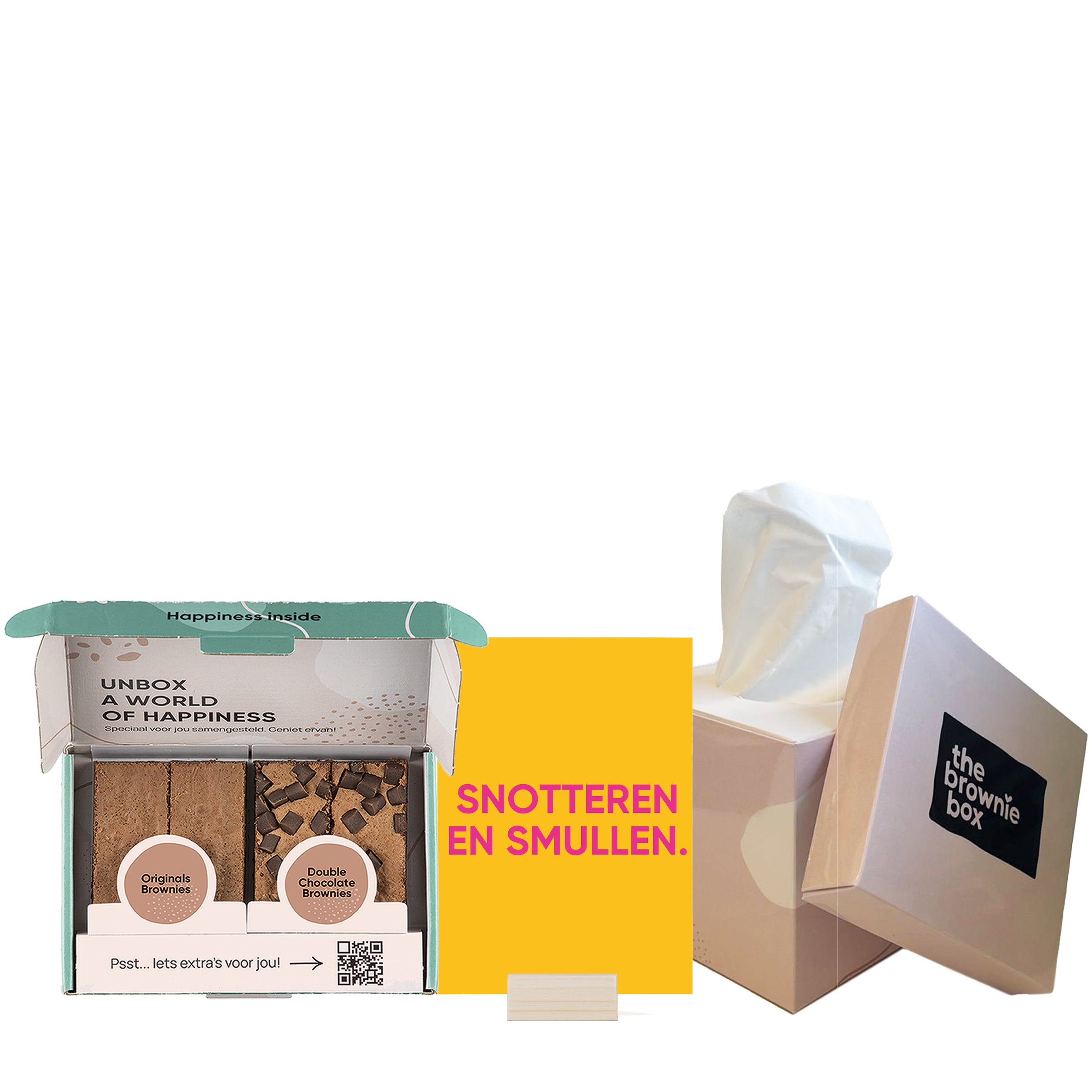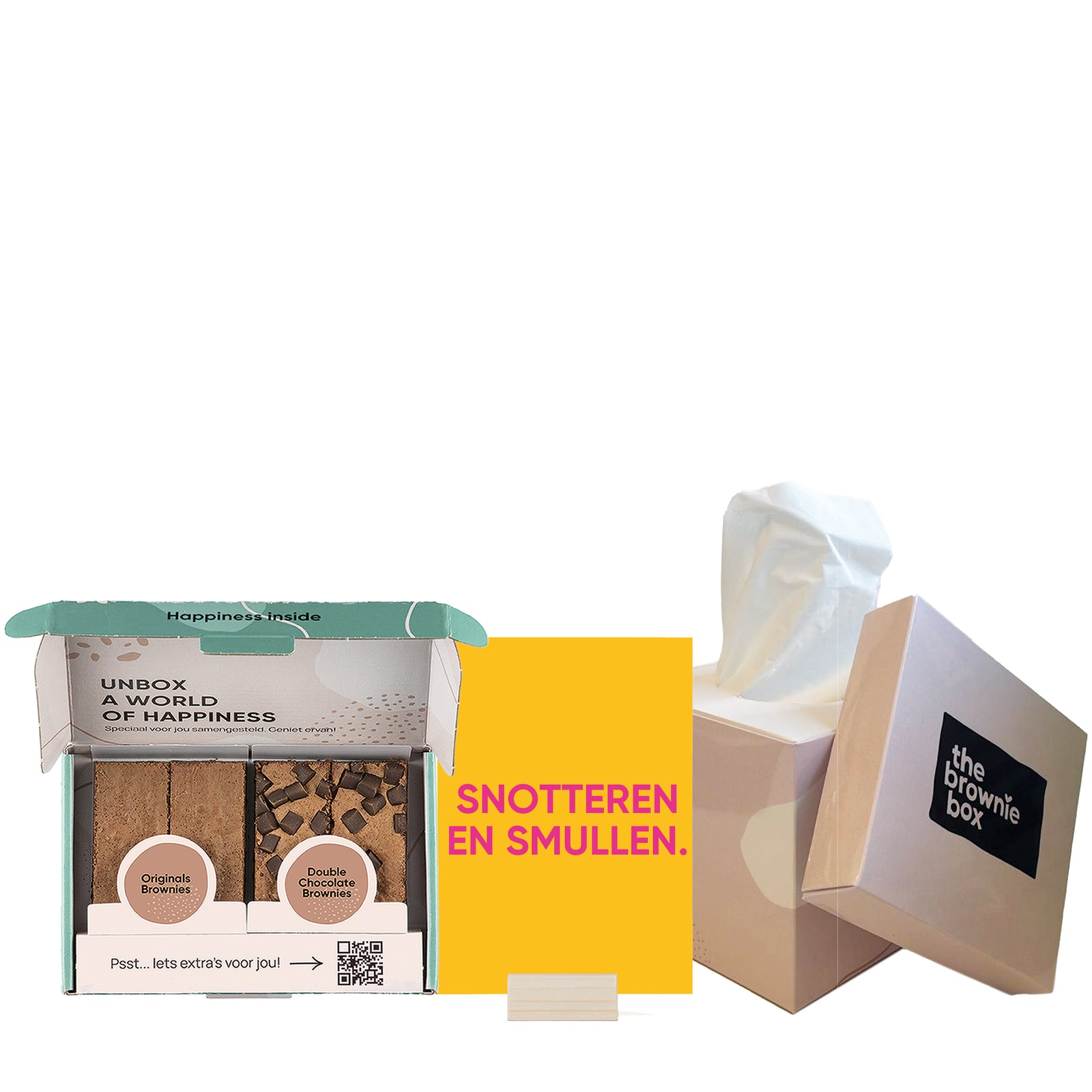 Snotteren mag, smullen ook. Deze cadeaubox is het perfecte troostpakket voor iedereen die verkouden op de bank ligt en wel wat chocolade kan gebruiken. Een kleine knipoog en een flinke dosis brownies om de neus en de dag weer een beetje op te vrolijken.