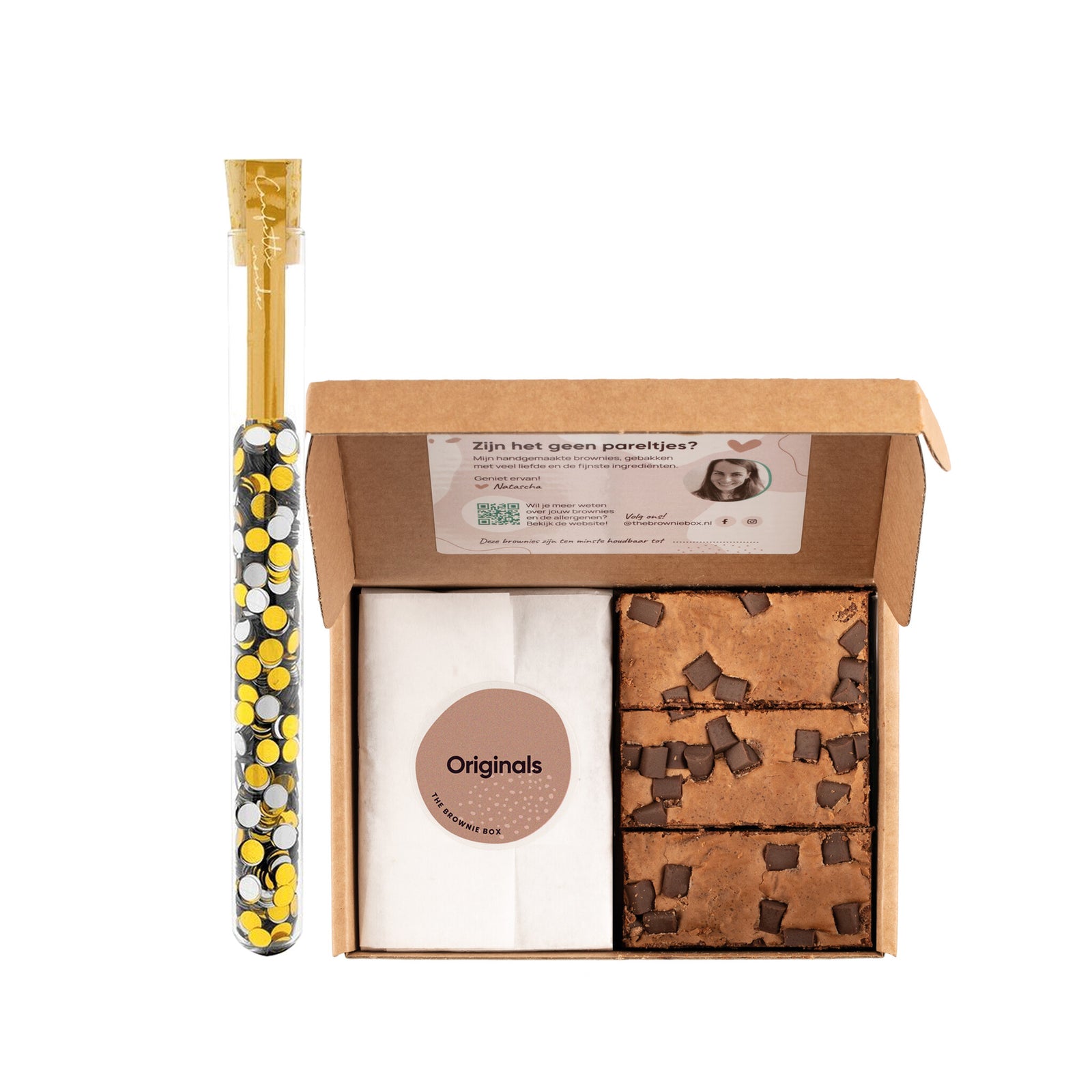Vier elk moment met onze verse handgemaakte brownies, compleet met sprankelende gouden en zilveren tafelglitters. Of het nu een verjaardag of spontane verrassing is, dit brievenbuscadeau maakt van elk moment iets bijzonders.