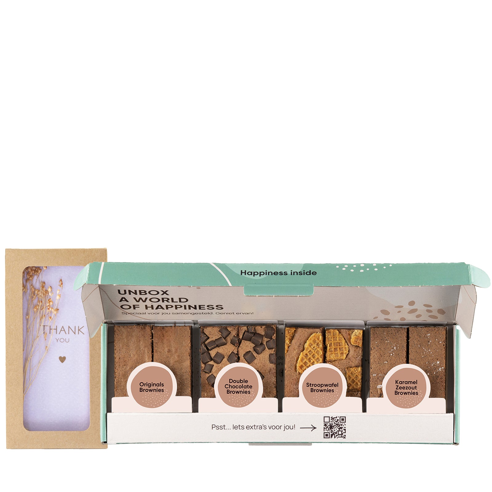 Gezellig genieten van dit leuke brievenbuscadeautje! Gevuld met heerlijke brownies en lief geschenkdoosje met kaartje en droogbloem in mini-klein-standaard.