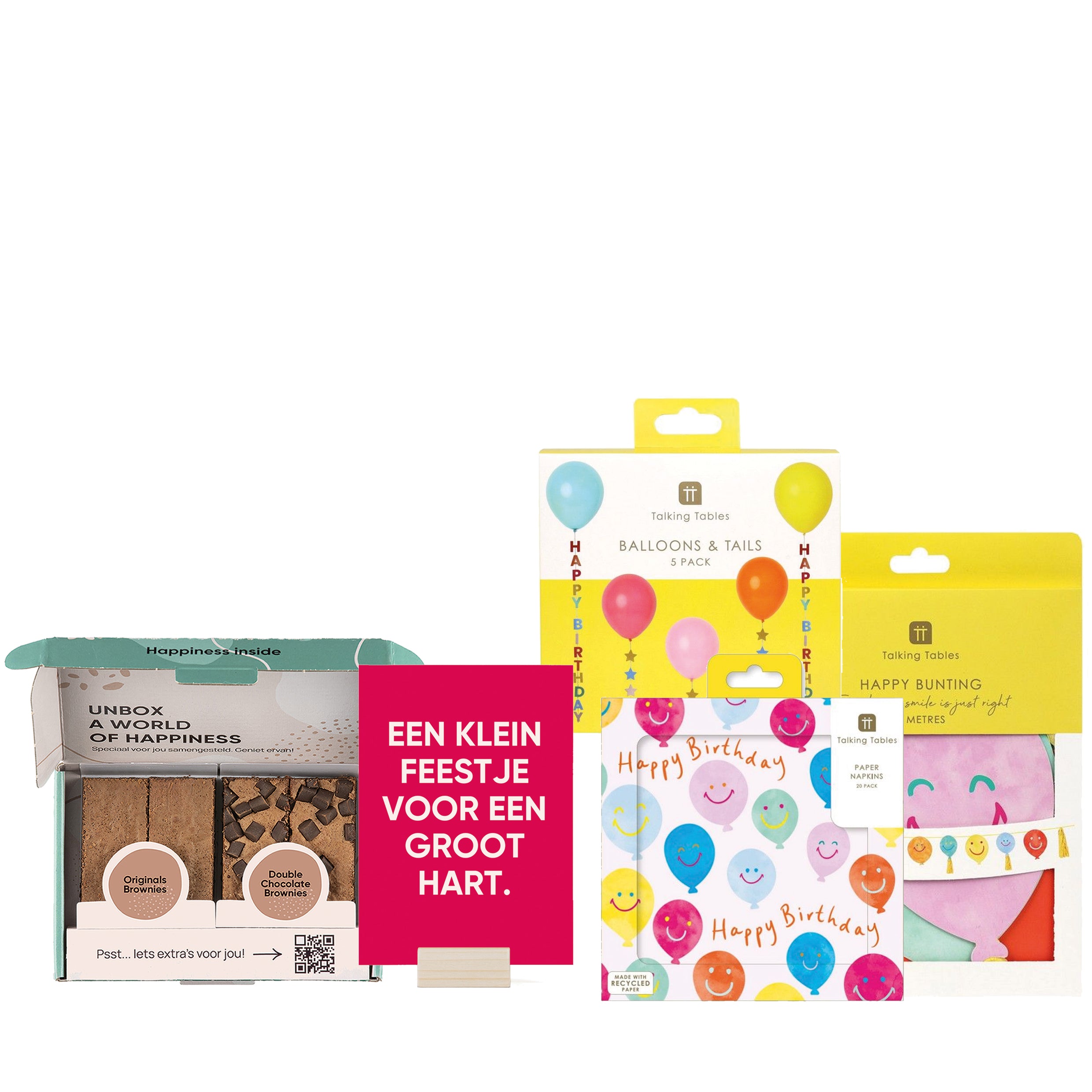 Verras iemand met een compleet verjaardagscadeau dat feest én smaak samenbrengt. In deze luxe giftbox vind je een Brownie Box met 2 Double Chocolates en 2 Originals brownies, vrolijke Birthday Balloons, feestelijke slingers, en Happy Birthday servetten. Het geheel wordt compleet met een kaart en kaarthouder met de tekst: “Een klein feestje voor een groot hart.” Een origineel en hartverwarmend verjaardagscadeau voor elke jarige.