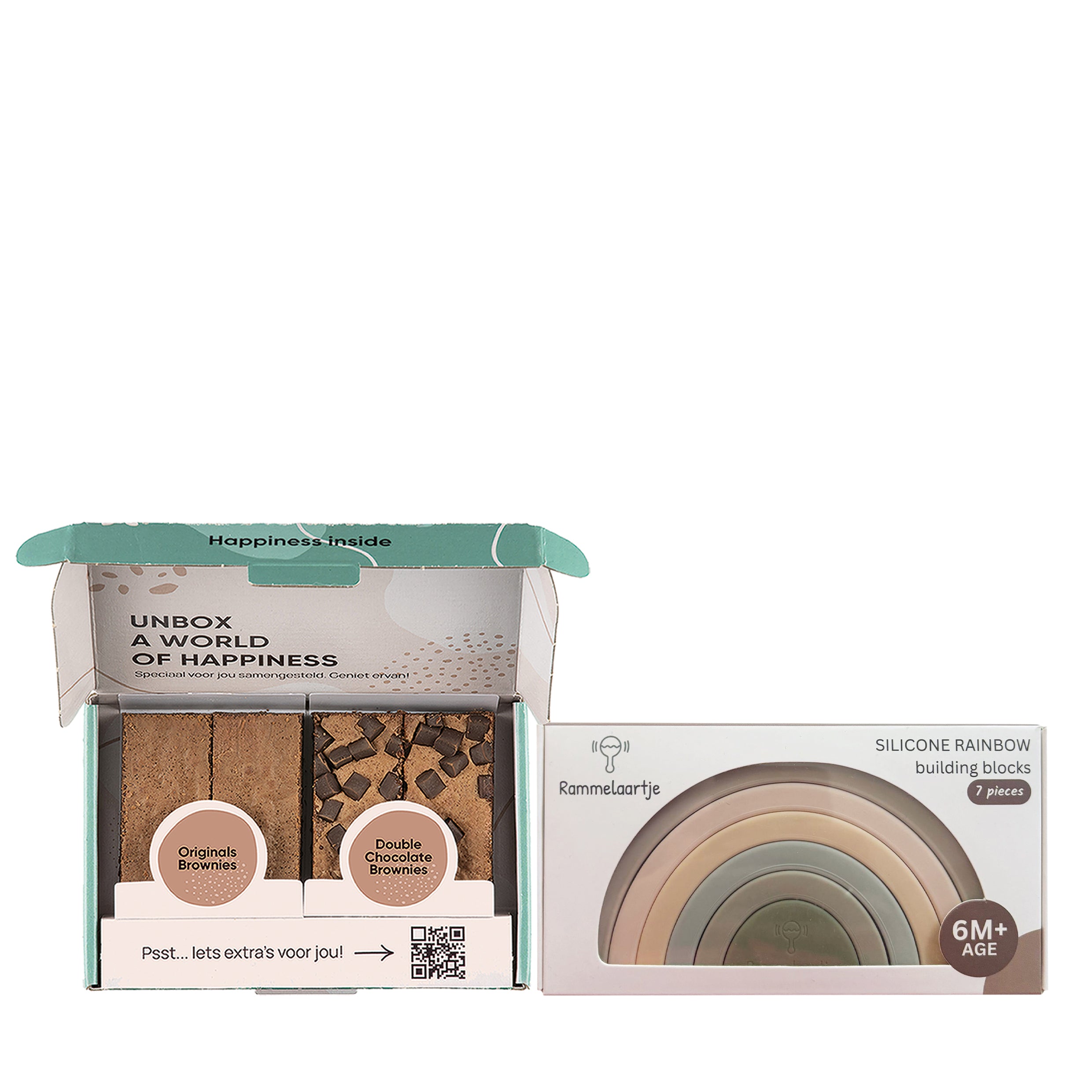 Dit is het perfecte pakket voor ouders én kleintjes. Terwijl de ouders genieten van zes smeuïge brownies uit onze bakkerij, kan de baby zich heerlijk vermaken met een zachte, flexibele siliconen regenboog stapeltoren. Leuk om mee te spelen én fijn bij doorkomende tandjes.