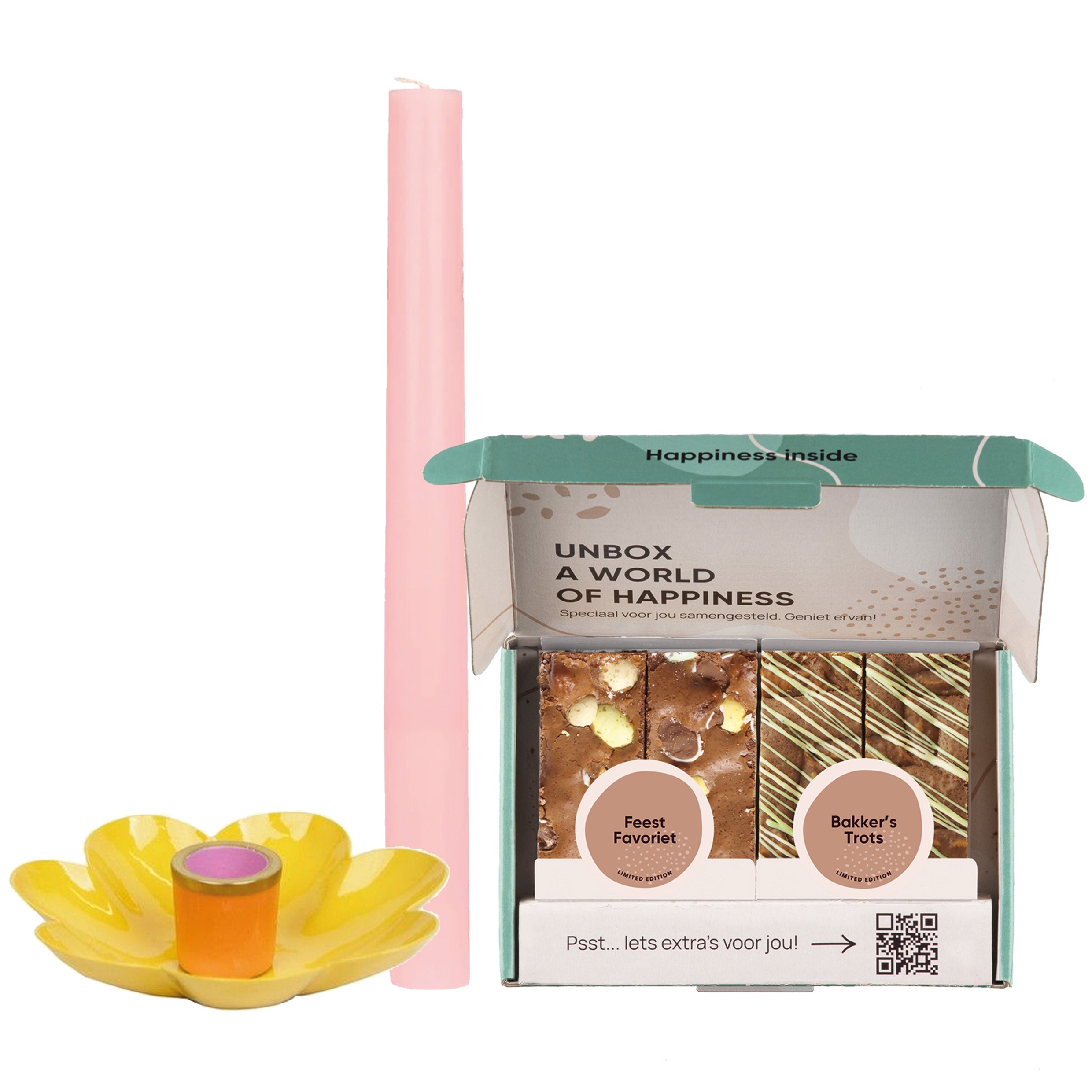 Op zoek naar een cadeau voor op de Pasen? Kies dan voor dit leuke paascadeau met onze heerlijke Limited Edition Paasbox. Vrolijke gele bloemen kaarshouder en roze kaars. Zalige Paasdagen!