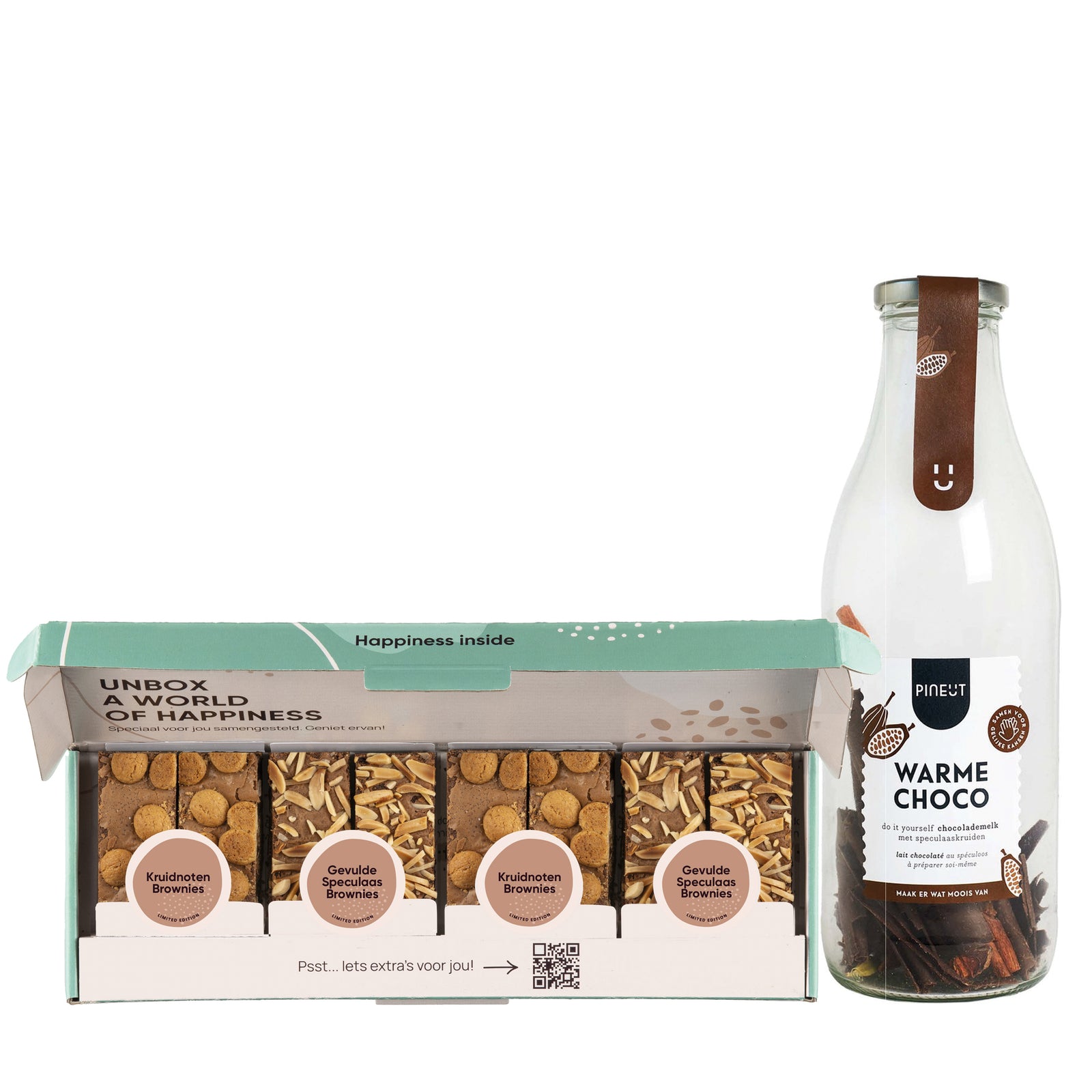 Geniet van een heerlijke Sinterklaaservaring met een warme chocomel en een browniebox vol lekkernijen. De box bevat maar liefst vier gevulde Speculaas brownies en vier Van Delft Kruidnoten Brownies. Perfect voor een gezellig moment thuis, bij de borrel of tijdens het Sinterklaasfeest. Zoet, kruidig en onweerstaanbaar, Een traktatie voor jong en oud!